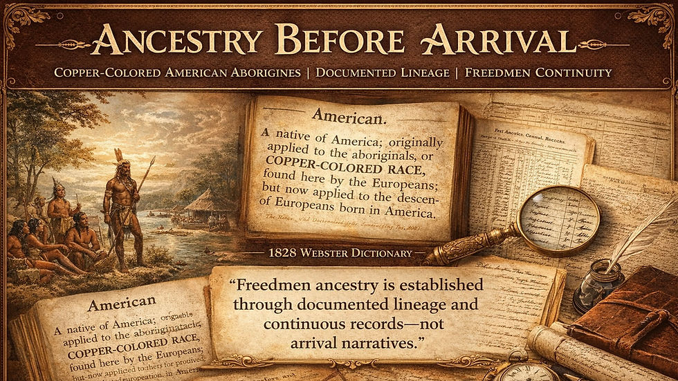Early dictionaries were functional references used by educators, courts, and administrators. Their terminology reflects a period when origin, presence, and status were more precisely distinguished. Later racial systems—designed for administrative control—flattened these distinctions, erasing American Aborigine identity and obscuring Freedmen lineage.